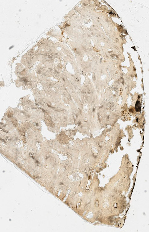 The anthropological examination to determine the individual’s sex was performed in accordance with published methods [24‒27], as was estimation of the age at death [24, 27‒30]. Radiological examinations were performed with plain X-ray imaging and a multislice CT-scanner (Somatom 6, Siemens Medical Solutions, Germany). The CT scan was obtained using the following parameters: 150mAs, 130kV, 1.25 mm slice thickness, reconstruction in a bone image kernel (B70). For histological analysis, a fragment of the lesion was taken from the tabula externa and interna of the skull (fig. 3). Pathological processing was routine, with formalin fixation, decalcification and paraffin embedding with subsequent slicing and staining with haematoxylin and eosin, and elastica van Gieson to demonstrate the different components of the matrix [4]. Unstained hard-cut sections were also prepared using bio-epoxide resin (Biodur®) and a microtome (Leica) with an inner diameter saw.