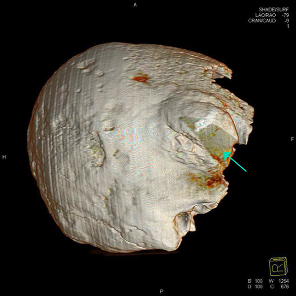 Computed tomography three-dimensional reconstruction of the skull. Wedge-shaped area in the centre of the lesion filled with material of lower X-ray density than the adjacent bone (green arrow).