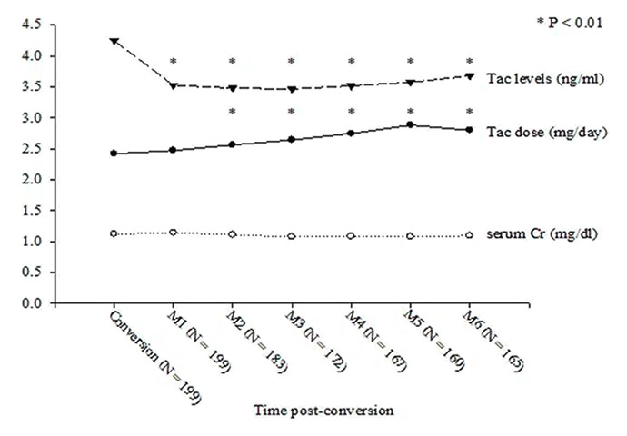 The mean serum creatinine level had been stable between the periods of conversion to six month postconversion (fig. 1). In addition, we saw no significant changes in the lipid profile, blood glucose level, liver function test and haemoglobin level.