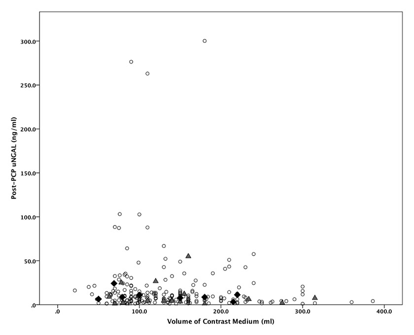 Relationship between the volume of contrast medium used and the post-PCP uNGAL levels in patients without CI-AKI (white disk), and with CI-AKI defined by the classical criteria (grey triangle) or by the AKIN criteria (black diamond) (normal uNGAL range ≤132 ng/ml). CI-AKI = contrast-induced acute kidney injury; PCP = percutaneous coronary procedure; uNGAL = urinary neutrophil gelatinase-associated lipocalin.