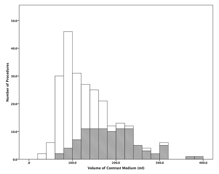 Distribution of the volume of contrast medium used for diagnostic (white areas) and for therapeutic (dashed areas) percutaneous coronary procedures.