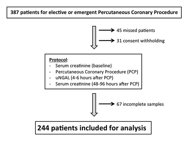 Figure 1 depicts the flow chart of the study. During the inclusion period, 387 patients underwent PCP at our institution. Of these, 45 patients were lost due to off-hour procedures or urgent transfer for surgery, 31 patients refused participation in the study, and 67 initially included patients were excluded from analysis due to missing urine or blood samples (principally secondary to missed follow-up appointments). The remaining 244 patients constitute the study population.