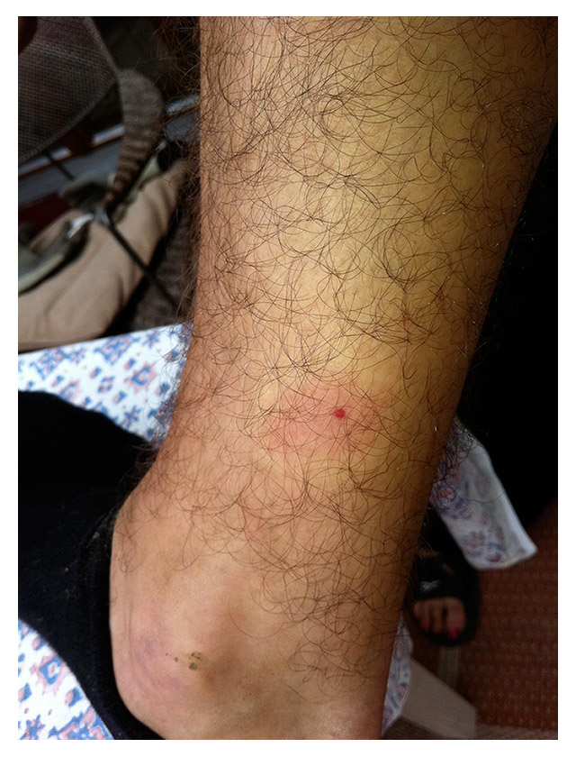 Leg of patient 1, two hours after bite by Amaurobius ferox.