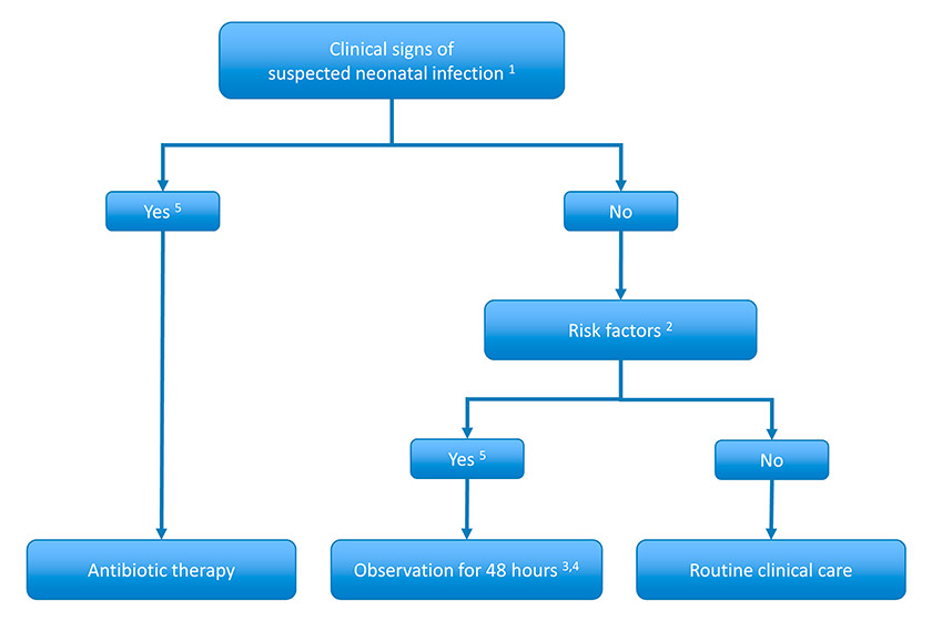 The aim of this guideline is to assist healthcare workers providing care for neonates in the assessment and management of neonates at increased risk for early-onset sepsis. The goal is to prevent early-onset sepsis, to facilitate an early diagnosis and to avoid unnecessary or prolonged antibiotic therapy. Generally, preterm infants younger than 34–35 weeks gestation need special care and are hospitalised in neonatology units, and are therefore not discussed in these guidelines. This guideline focuses on term and late preterm infants (>34 weeks gestation) at risk for early-onset bacterial infection.