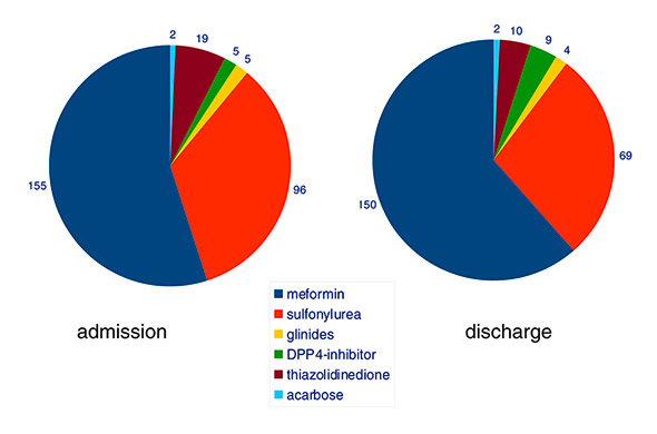 On admission, 230 of the 275 patients in group A (84%) were on treatment with one or more oral antidiabetic drugs (OADs) (fig. 3); 157 patients (68%) received monotherapy, 63 (27%) had two OADs, and 10 patients (4%) were treated with three drugs. During hospitalisation, combination therapy was reduced, mainly due to the introduction of insulin therapy. Figure 4 depicts the numbers of patients treated with various OADs alone or in combination. Metformin was used most frequently, followed by sulphonylureas. GLP-1 analogues were not used in our cohort. In group B, 11 patients (48%) were started on metformin therapy; two patients with eGFR <60 ml/min received sulphonylurea instead (not shown). No other OADs were prescribed in this group.