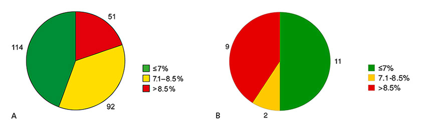 In group A, mean (± standard deviation [SD]) HbA1c was 7.66% ± 1.73%. Of the 257 patients (93.5%) for whom information on HbA1c was available, 114 (44%) showed HbA1c values at target levels (≤7%). In 92 patients (36%), HbA1c was >7% but ≤8.5%, and in 51 (20%), HbA1c was >8.5% (fig. 2A). In group B, HbA1c levels were available in 22 of 23 (96%) patients, with a mean (± SD) value of 8.42% ± 2.47%. HbA1c was <7% in 11 patients (50%), >7% but ≤8.5% in two (9%), and > 8.5% in nine patients (41%) (fig. 2B).