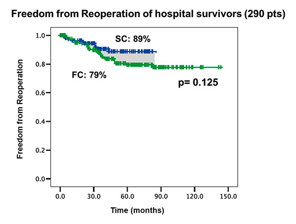 Freedom from re-operation at follow-up (290 patients); SC: blue; FC: green.
