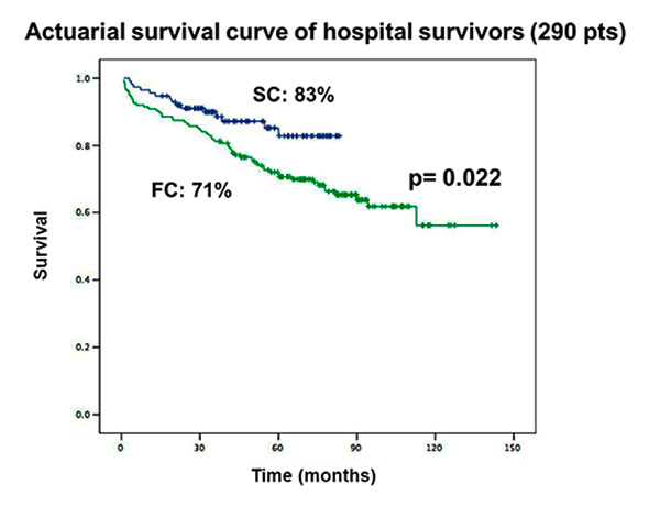 Actuarial survival of hospital survivors (290 patients); SC: blue; FC: green.