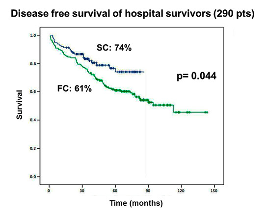 Disease free survival of hospital survivors (290 patients); SC: blue; FC: green.