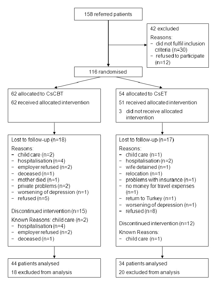 Patients were randomly allocated to attend either culturally sensitive cognitive-behavioural treatment (CsCBT) or culturally sensitive exercise treatment (CsET). Both interventions comprised twenty-five 90-minute sessions within a six-month period and were adapted concerning structural and didactic aspects to a culturally sensitive context.