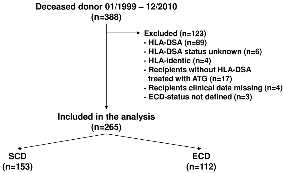 ATG = anti-T-lymphocyte globulin; ECD = expanded-criteria donor; HLA-DSA = donor-specific HLA-antibodies; SCD = standard-criteria donor