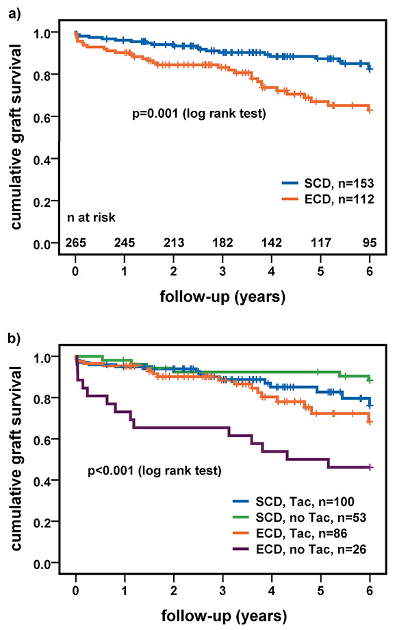 (a) Cumulative graft survival stratified by donor status. (b) Cumulative graft survival stratified by donor status and immunosuppression; p-values of difference between subgroups in figure 2b: ECD/Tac versus ECD/no Tac p = 0.008 (log rank test); SCD/Tac versus SCD/no Tac p = 0.1 (log rank test).