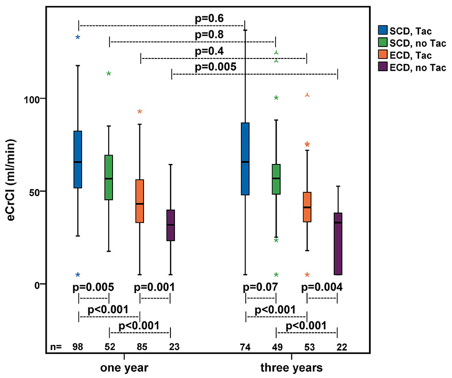 Recipients of ECD kidneys treated with Tac had a higher median eCrCl than those treated without Tac at one year (43 ml/min [range 5–93 ml/min] vs 32 ml/min [range 5–64 ml/min], p = 0.001) and at three years (41 ml/min [range 5–102 ml/min] vs 33 ml/min [range 5–53 ml/min], p = 0.004) after transplantation. In recipients of SCD kidneys there was a significant difference between those treated with Tac and those treated without Tac at one year (66 ml/min [range 5–133 ml/min] vs 57 ml/min [range 18–113 ml/min], p = 0.005), whereas at three years the difference was not significant (66 ml/min [range 5–137] vs 57 ml/min [range 5–124 ml/min], p = 0.07) (see fig. 4). Regarding the kidney function over time, recipients of ECD kidneys treated without Tac had a significant decrease in eCrCl from one to three years (median change –3.2 ml/min, p = 0.005). In recipients of ECD kidneys treated with Tac (median change 0.0 ml/min, p = 0.4) and in recipients of SCD kidneys treated with Tac (median change 0.3 ml/min, p = 0.6) or without Tac (median change –0.5 ml/min, p = 0.8) graft function remained stable over time (see fig. 4).