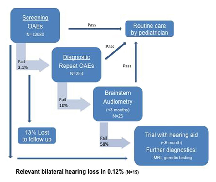 In the University Hospital Zurich, follow-up takes place at an average age of 2.4 months. The screening fail rate of 2.1%, with an ultimate relevant bilateral hearing impairment in 0.12% is consistent with published results [6].