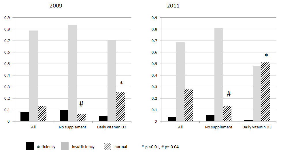 Effects of vitamin D3 supplementation: X-axis: 3 groups: all patients, nonsupplemented patients and patients with daily supplement of vitamin D3; Y-axis: percentage of patients with deficiency, insufficiency or normal results (1 = 100%); * and #: comparison between 2009 and 2011, the number of patients with normal results being significantly higher in 2011