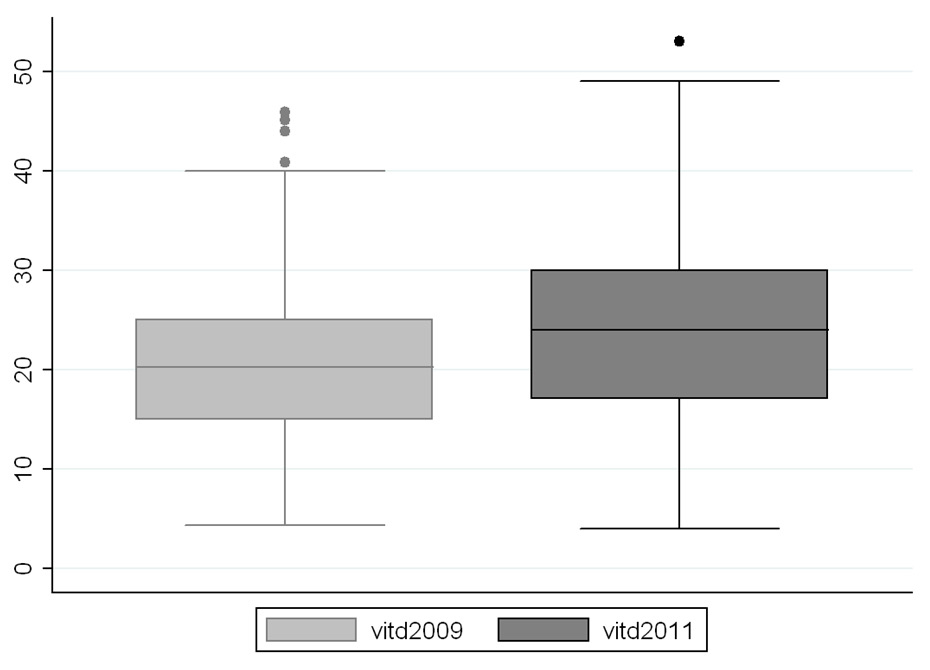 Mean 25-OH vitamin D (in ng/ml) in 2009 and 2011, p = 0.0001