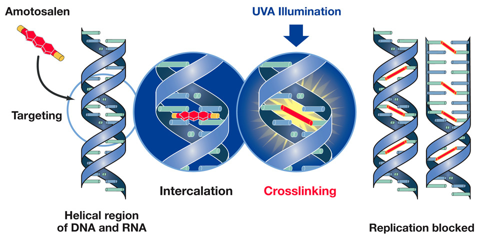 Schematic representation of the mode of action of INTERCEPT®. Amotosalen intercalates within DNA/RNA. DNA/RNA crosslinks upon UVA irradiation. This blocks reproduction of pathogens and leucocytes.