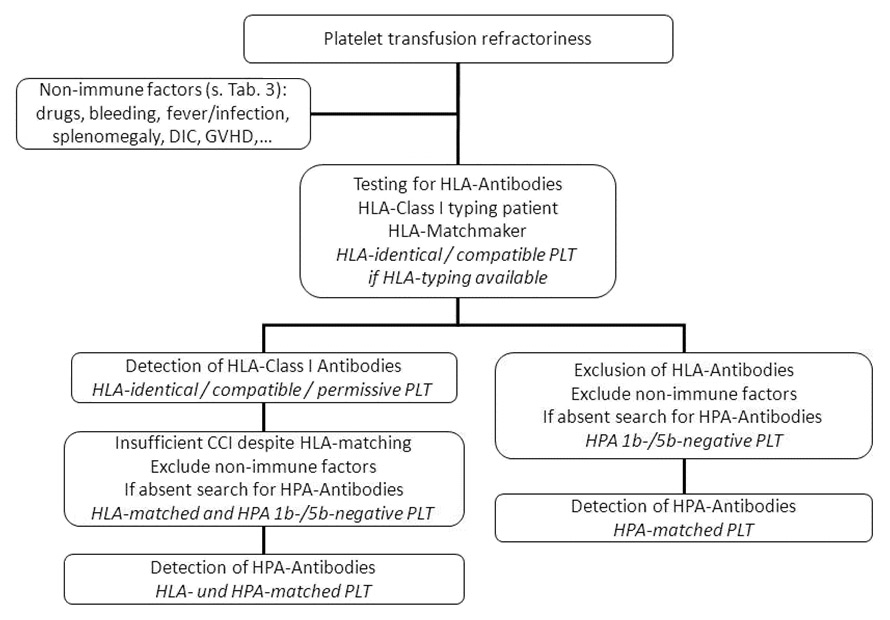In refractory patients, nonimmune aetiologies have first to be excluded (table 2 and fig. 3). If immune PLT transfusion refractoriness is suspected, a search for HLA-antibodies should be initially performed. If HLA antibodies are detected, various options for the selection of suitable PLT units are available. All of them require HLA class I typing of PLT donors: