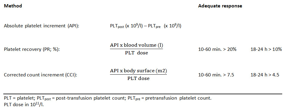 Assessment of PLT transfusion efficacy is a major challenge. Several criteria have been developed and evaluated, most of them including the post-transfusion PLT count (fig. 2).
