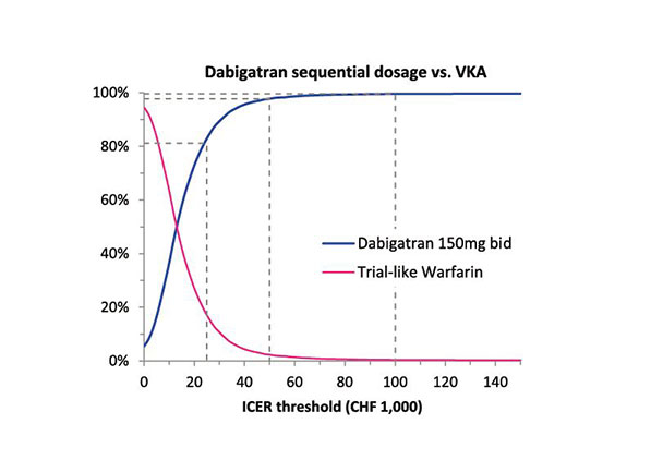 When incremental costs are compared to QALYs gained, dabigatran 110 mg yielded an ICER of CHF 25,108 per QALY, dabigatran 150 mg yields CHF 9,702 per QALY, and sequential dose dabigatran yields CHF 10,215 per QALY.