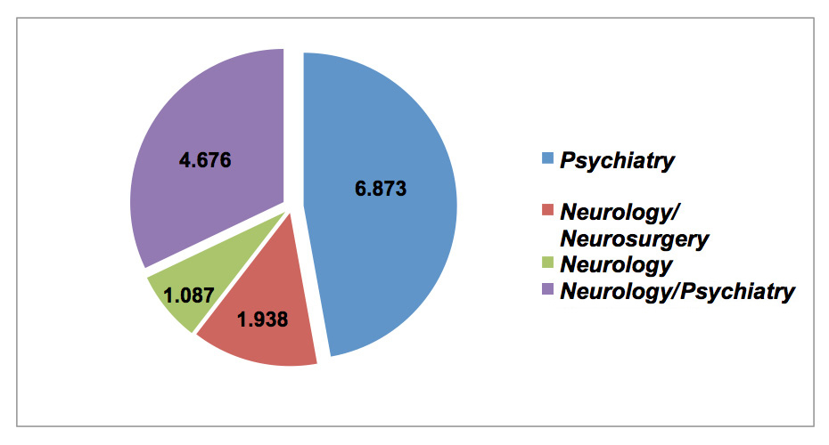 We also aimed to divide the total costs by discipline. Psychiatry includes the following disorders: psychotic, personality, child/adolescent, mood, anxiety, somatoform and eating disorders were assigned to Psychiatry. Neurology alone was decided to include: neuromuscular disorders, multiple sclerosis, headache. A mixed neurology/neurosurgery category was defined to consist of brain tumours, Parkinson’s disease, traumatic brain injury, stroke and epilepsy. A mixed neurology/psychiatry category included dementia, mental retardation, addiction (alcohol use disorders and opioid dependence), and sleep disorders. Note that clinical psychology or neuropsychology contribute to all these medical disciplines to a greater or lesser extent.