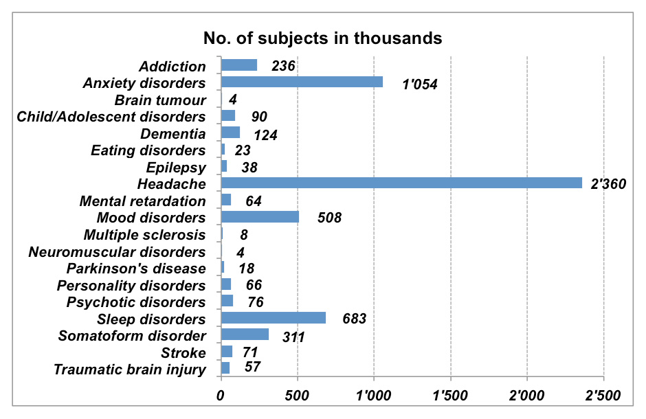 Estimated number of subjects with a specific disorders of the brain in Switzerland in 2010 based on data from the 2011 European Brain Council (EBC) study.