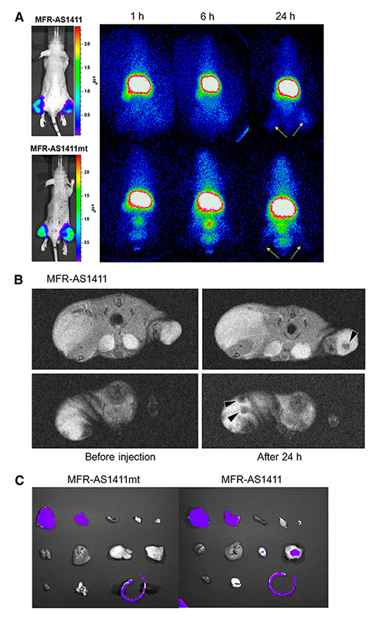 In vivo multimodal cancer targeting and imaging using MFRAS1411 particles. (A) MFR-AS1411 particles were intravenously injected into tumour-bearing mice and radionuclide images were acquired at 1, 6 and 24 h after injection. Scintigraphic images of C6 tumours in mice that received MFRAS1411 showed that C6 tumours had accumulated MFR-AS1411 at 24 h after injection but did not accumulate MFRAS1411mt (n 5 3). Tumour growth patterns were followed using bioluminescence signals acquired from luciferase-expressing C6 cells. (B) Magnetic resonance images of tumour-bearing mice before and after injection of MFR-AS1411 were acquired. Dark signal intensities at tumour sites were detected in MFR-AS1411–injected mice (arrowhead). (C) Tumours were isolated and their fluorescence verified using IVIS200 system. Fluorescence signal at tumour site injected with MFRAS1411 was detected, compared with tumours injected with MFR-AS1411mt. Isolated organs in order from upper left to lower right were intestine, liver, spleen, muscle, fat, kidney, stomach, right tumour, left tumour, heart, lung, and tail. Reprinted by permission of the Society of Nuclear Medicine from [50].