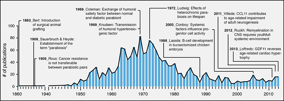 The annual number of publications including parabiosis experiments is shown from 1860 to 2013. Several studies are highlighted as they provided groundbreaking findings. All values have been extracted from http://www.gopubmed.org.