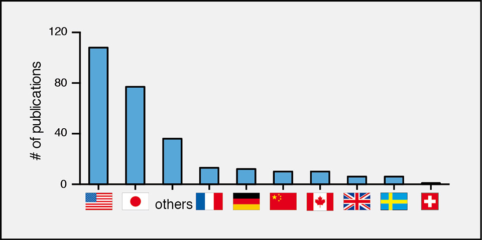 Publications including parabiosis experiments are listed for different countries. All values have been extracted from http://www.gopubmed.org