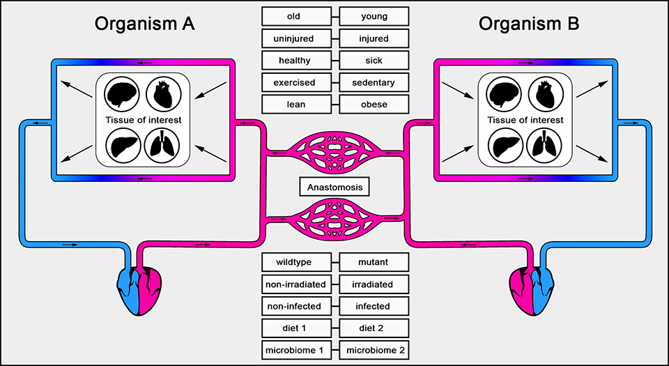 Organism A and B share a common blood supply, which spontaneously develops through anastomosis after surgery. Organisms with different physiological conditions may be used for parabiosis in order to assess the systemic effect of one organism on a particular tissue of interest in its attached partner.