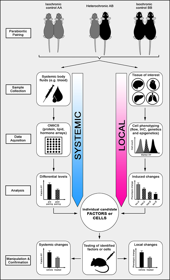 Using heterochronic pairings of young (A) and old (B) mice allows assessment of the effect of a young systemic environment on a particular local tissue of interest in the aged partner and vice versa. Isochronic pairings (AA or BB) are important controls to exclude surgery-related observations and to determine age-related changes in the systemic environment. Briefly, systemic body fluids such as blood, lymph or cerebrospinal fluid are collected, assessed with omics tools such as protein, lipid or hormone arrays and analysed for differential levels of soluble factors and after parabiosis. A particular tissue of interest is isolated, phenotypically characterised by flow cytometry, immunohistochemistry (IHC) or epi-/genetic measures and analysed for parabiosis-induced phenotypic changes. The integration of these data leads to the identification of individual candidate factors or cells that can subsequently be tested in a suitable mouse model.