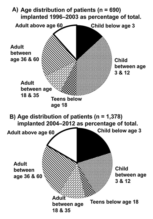 (A) Patients implanted in Switzerland 1999–2003 and (B) Patients implanted in Switzerland 2004–2012, divided into age groups [11].
