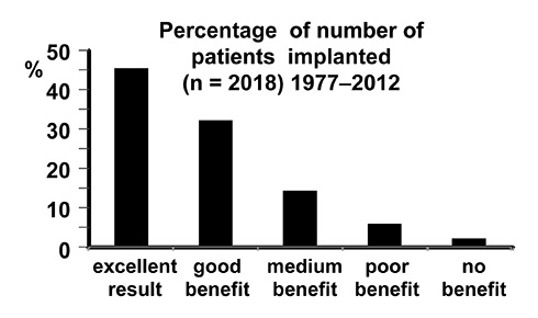 Subjective benefits of cochlear implant users implanted until 2012 in Switzerland. Patients with first generation single channel implants as well as patients with implant use shorter than 6 months were excluded from this summary. Patients were asked to describe their benefit on a five-point scale from “no benefit” to “excellent” [11].