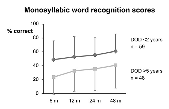 Speech recognition (tested at 80 dB sound pressure level) for the Freiburg monosyllabic test in 107 unilaterally implanted adults over 2 years after implantation. The patients are divided into two groups dependent on duration of deafness (DOD) prior to implantation [23]. Average (±1 standard deviation) monosyllabic word recognition scores are displayed over time after first fitting in months (m) for a group of 59 adult CI patients with a DOD <2 years (average 1.88 ± 1.24 years) and a group of 48 adult CI patients with a DOD of >5 years (16.1 ± 12 years).