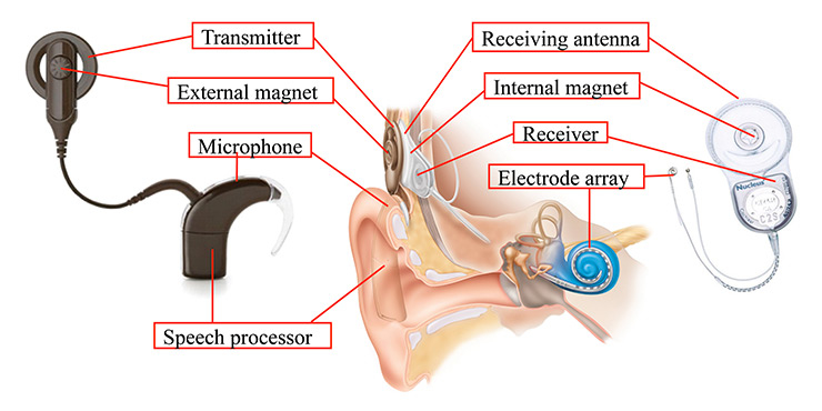 Illustration of cochlear implant components. The external parts are shown on the left, the internal components of the implant on the right. The scheme in the middle shows the position of the cochlear implant components in situ.