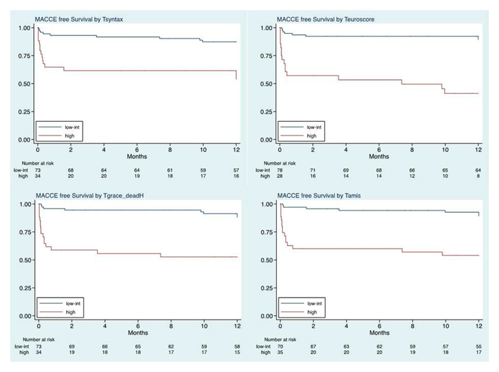 One-year MACE-free survival curves in patients stratified in the higher and lower/mid tertiles according to log EuroSCORE (upper right panel), the GRACE score (lower left panel), the AMIS score (lower right panel), and the SYNTAX score (upper left panel).