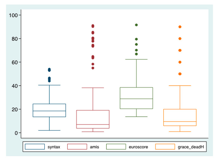 Boxplot showing the distribution of the log EuroSCORE, the GRACE score, the AMIS score, and the SYNTAX score in the study population; boxes represent the 25th and 75th percentile and midlines represent the median; whiskers represent the range excluding the extreme outliers (±3D), which are shown as dots.