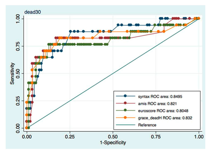 Sensitivity vs specificity curves for the logEuroSCORE, the GRACE score, the AMIS score, and the SYNTAX score with respect to the study’s primary end point (30-day mortality). ROC areas for all scores are indicated.