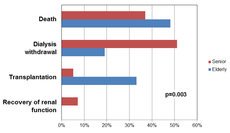 Another important outcome was the reason for cessation of haemodialysis. There was a statistically significant difference between the two groups regarding kidney transplantation and withdrawal of haemodialysis. Although more senior than elderly patients decided to stop haemodialysis, more elderly patients underwent kidney transplantation. Why is the withdrawal rate of haemodialysis higher in seniors than in the elderly? One reason might be specific treatment problems bothering older patients on haemodialysis, which decrease their quality of life. Further, they may suffer from a life-threatening illness, turning haemodialysis into a death prolonging therapy, which can lead to the decision to withdraw it. Interestingly, however, death as reason for cessation of haemodialysis was equally frequent in both groups (i.e. 37% in seniors and 48% in elderly, p = 0.82).