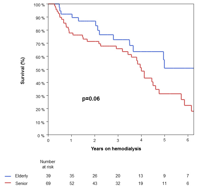 Patient survival of both groups is shown in the Kaplan Meier survival curves in figure 1. Number at risk gives the quantity of patients the analysis refers to. Because less than 50% of patients were still at risk 3 years after the start of haemodialysis, the curves at later time-points have to be interpreted with caution. There is only a trend towards better survival in younger patients on haemodialysis, with a three-year survival of 66% in seniors vs 73% in elderly and five-year survival of 32% in the senior collective vs 51% in the elderly p = 0.06 (fig. 1). During the observational time, about half of the patients died: 38/69 in the senior and 14/39 in the elderly group (55% in seniors vs 36% in elderly; p = 0.07). Overall, 22/38 (58%) of the seniors and 4/14 (29%) of the elderly withdrew from haemodialysis before they died (p = 0.12).