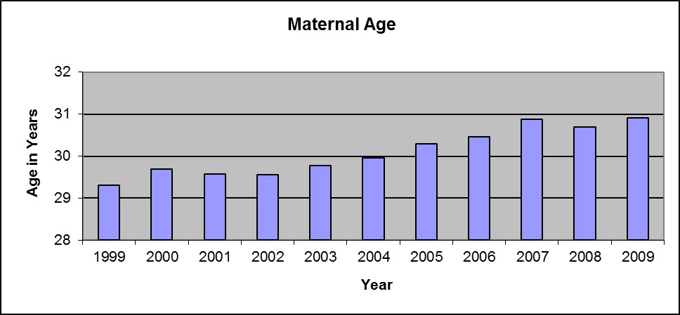 The maternal age increased significantly from 29.3 to 30.9 years in 2009 (p <0.0001).