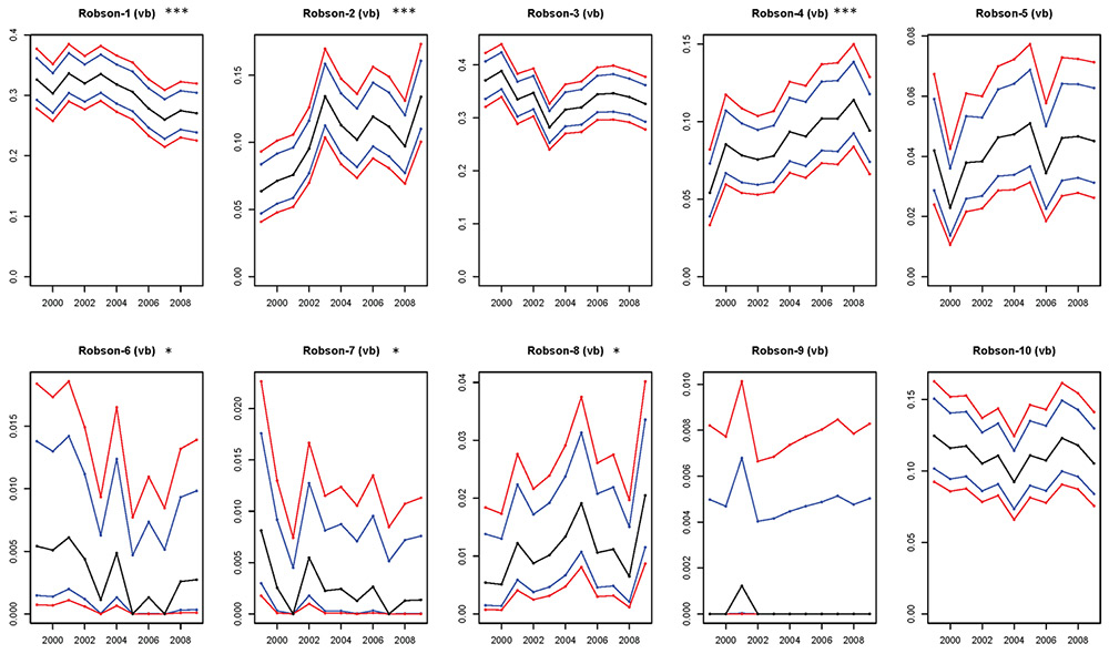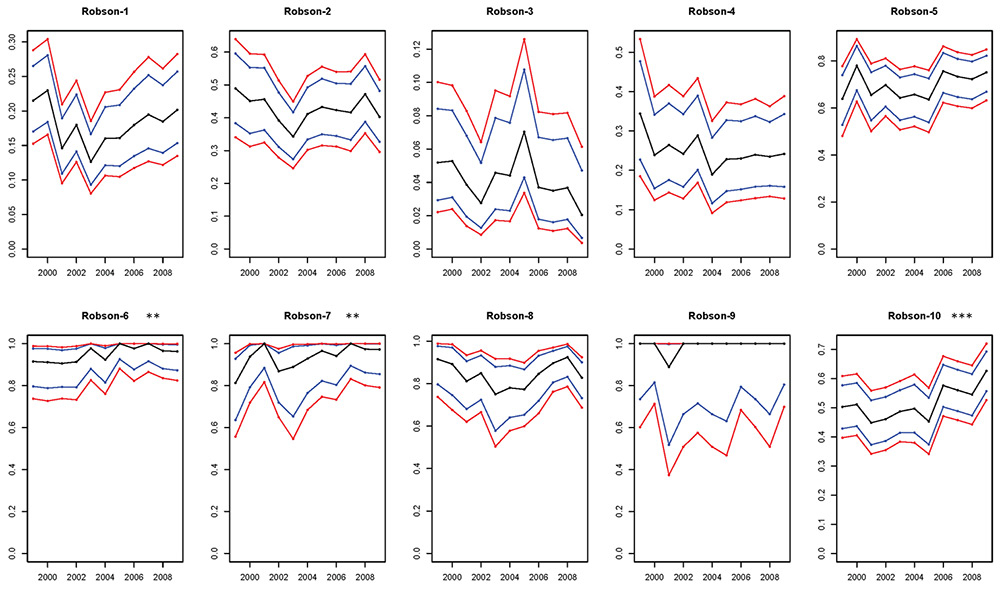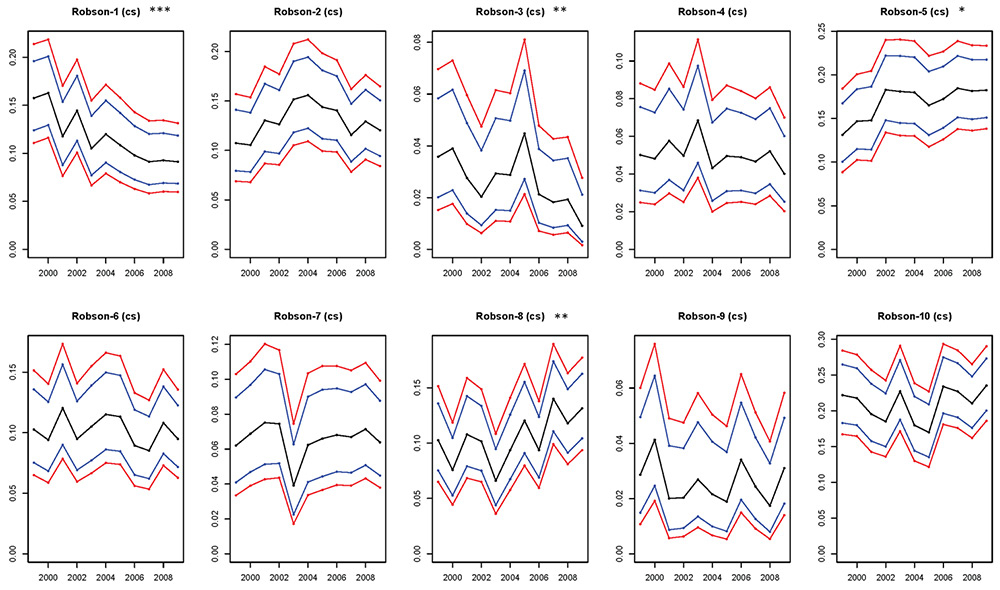 The temporal evaluation of CS rates displayed several changes over time; the results are summarised in figure 1. The overall CS rate increased significantly, to 42.8% in 2009 (p <0.001; fig. 2). A detailed temporal assessment of Robson groups displayed several changes in the CS rate and, interestingly, it increased significantly only in Groups 6, 7 and 10, reaching 96.3%, 97.2% and 62.6%, respectively, in 2009.