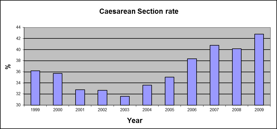 The overall caesarean section (CS) rate was 36.6% and increased significantly to 42.8% in 2009 (p <0.001).