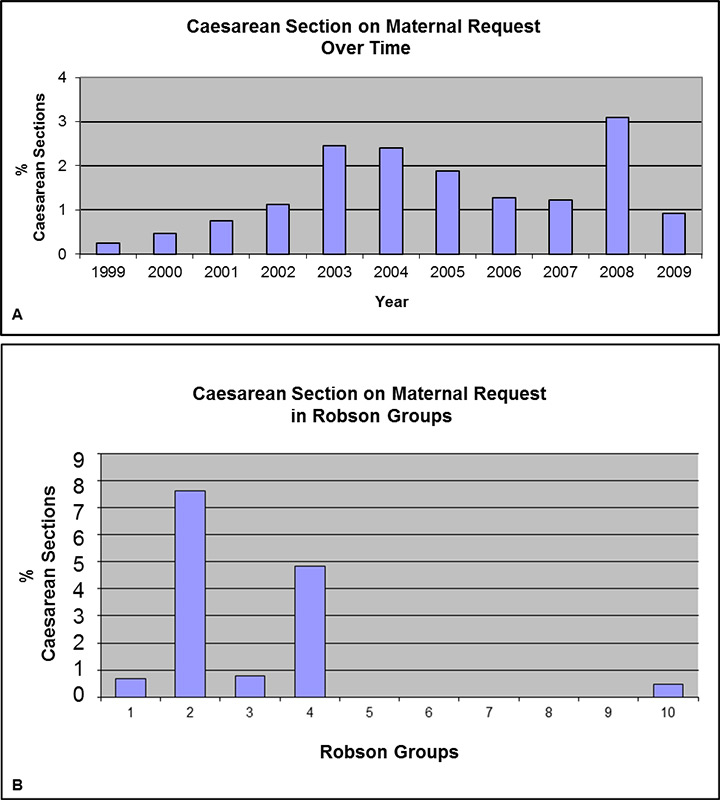 A: Temporal change of the caesarean section on maternal request (CSMR) rate in the observation period of time. The mean CSMR was 1.45% and a significant increase was detected (p = 0.008).
