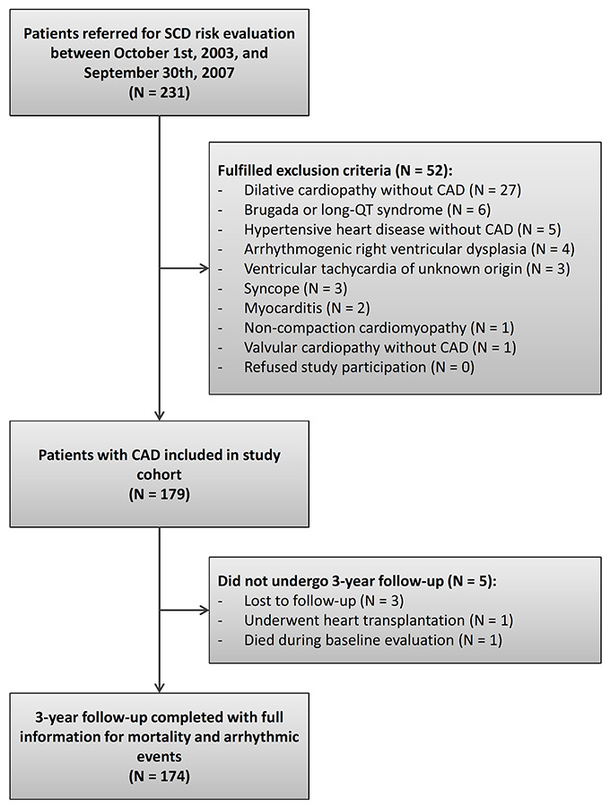 Between 1 October 2003 and 30 September 2007, 231 patients were referred for SCD risk evaluation. Of these, 52 patients (23%) were excluded because they fulfilled an exclusion criterion (fig. 2). Most of the excluded patients suffered from dilated cardiopathy without CAD. Of note, none of the eligible patients refused study participation. The study population finally consisted of 179 patients. Of these, only five patients (3%) did not undergo 3–year follow-up: three patients were foreign workers in Switzerland at the time of study inclusion who later moved away to their country of origin and were not contactable, one patient received heart transplantation during follow-up, and one patient died during baseline evaluation when examinations were not yet completed. The study population finally consisted of 174 patients with complete follow-up information.