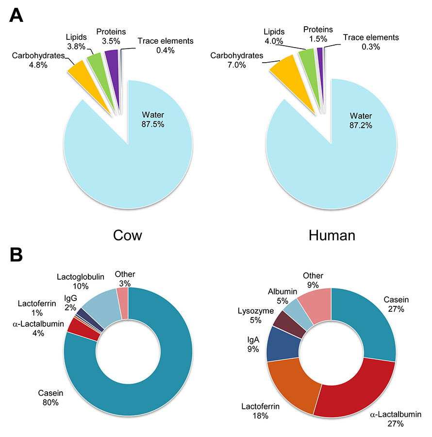 Composition of breast milk and cow’s milk. (A) General molecular classes given in percent of total mass. (B) Percentage of main types of milk proteins.