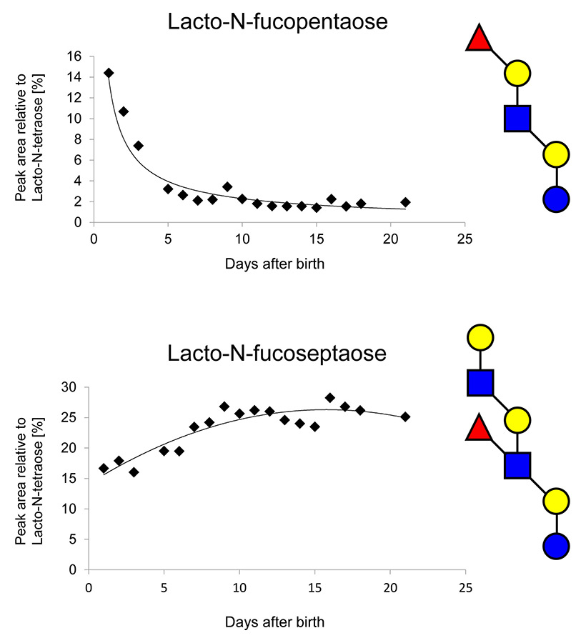 Relative amount of two complex milk oligosaccharides during lactation. The relative levels of the pentasaccharide lacto-N-fucopentaose drop rapidly in the first week of lactation, whereas the relative levels of the heptasaccharide lacto-N-fucoseptaose raise in the first 2 weeks of lactation. Oligosaccharide levels are compared with the constant levels of the milk tetrasaccharide lacto-N-tetraose. The oligosaccharide levels shown were analysed in breast milk samples collected from a single mother over 3 weeks after childbirth.