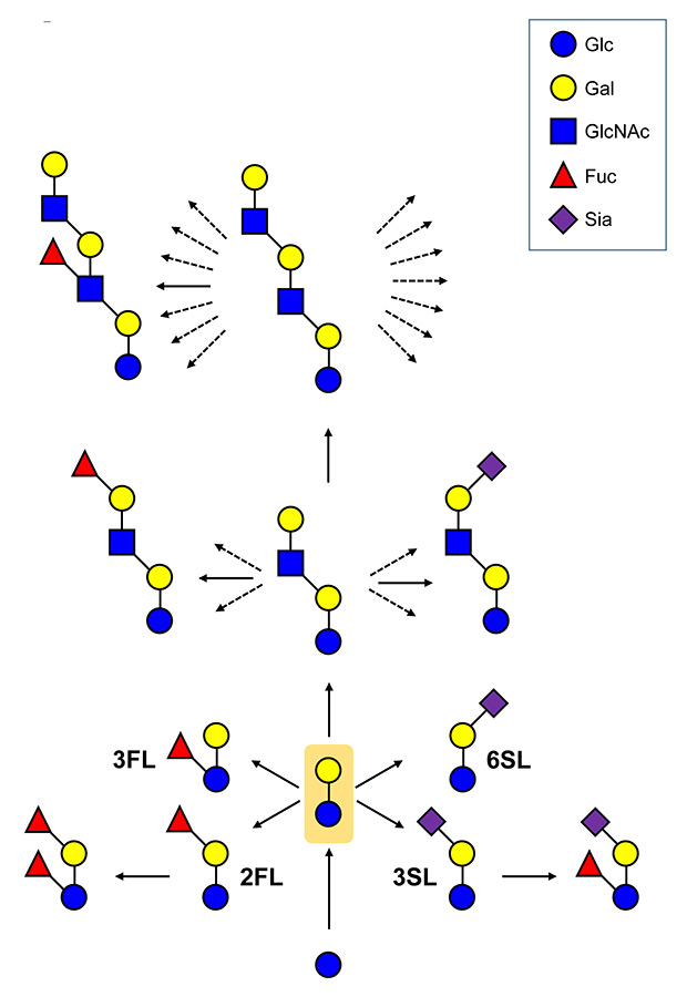 2FL = fucosyl(α1,2)lactose; 3FL = fucosyl(α1,3)lactose; 3SL = sialyl(α2,3)lactose; 6SL = sialyl(α2,6)lactose