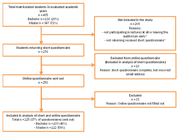 A total of 485 students were matriculated in the academic Bachelor year 1 (n = 138), Master year 1 (n = 174) and Master year 2 (n = 173) at the Medical Faculty of the University Basel between 1 October 2012 and 30 November 2012 (fig. 1). Out of these, 276 students participated in the lectures and returned the short questionnaire distributed beforehand. Out of the 485 students, 209 were missing because they did not participate in the lectures, left the auditorium early, or failed to return the short baseline questionnaire they received. The proportion of participants filling in the baseline questionnaire may thus not be calculated, given the unknown denominator. Had all 485 students participated in the three lectures from the beginning to the end, the response rate would have been 57% (276/485).