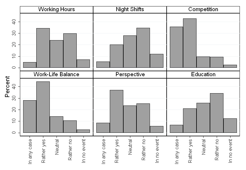 Which aspects of the work environment present a drawback to starting a surgical career: overtime hours (working hours), night shifts, strong competitive mentality inside the team (competition), apprehension of a bad work-life balance (work-life balance), unclear future perspectives (perspective), and lengthy and intensive education curriculum (education)? Please assign a value to each option. (Answering options with five descriptors: in any case – rather yes – neutral – rather no – in no event.)